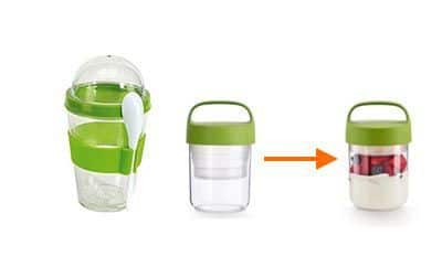 Respecto a la imagen de los yogures, puedes comprar ambos en Amazon.es. El primero es de «Vertrieb durch Preiswert & Gut» y el otro de «Lékué Jar To Go». El segundo, no recuerdo donde lo encontré. De todas formas si no lo encuentras puedes utilizar un dispensador para leche en polvo de fórmula, tendría la misma utilidad.
