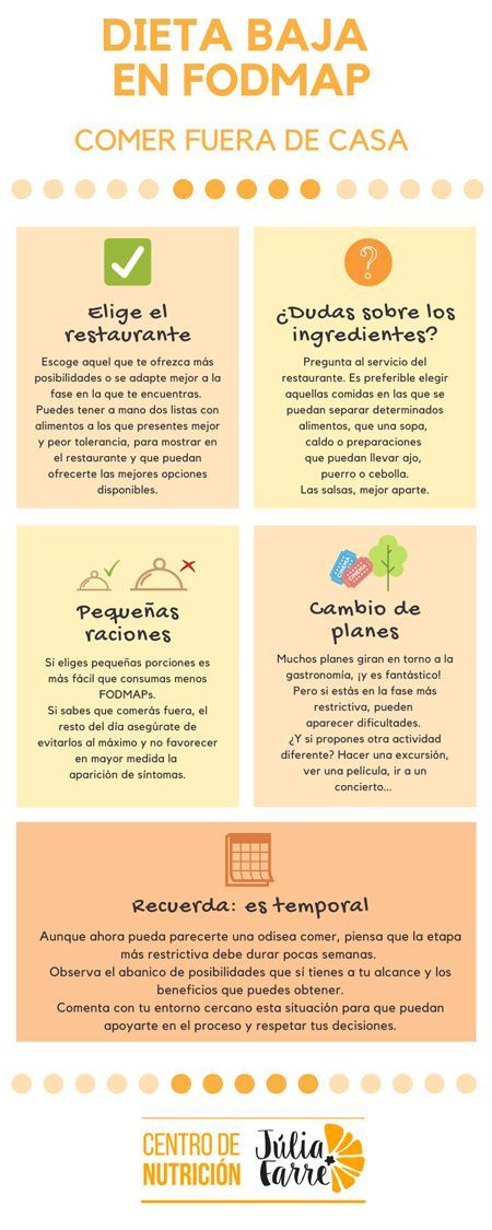 Alimentos permitidos: Bajos en FODMAPsAlimentos prohibidos: Moderado/rico en FODMAPs